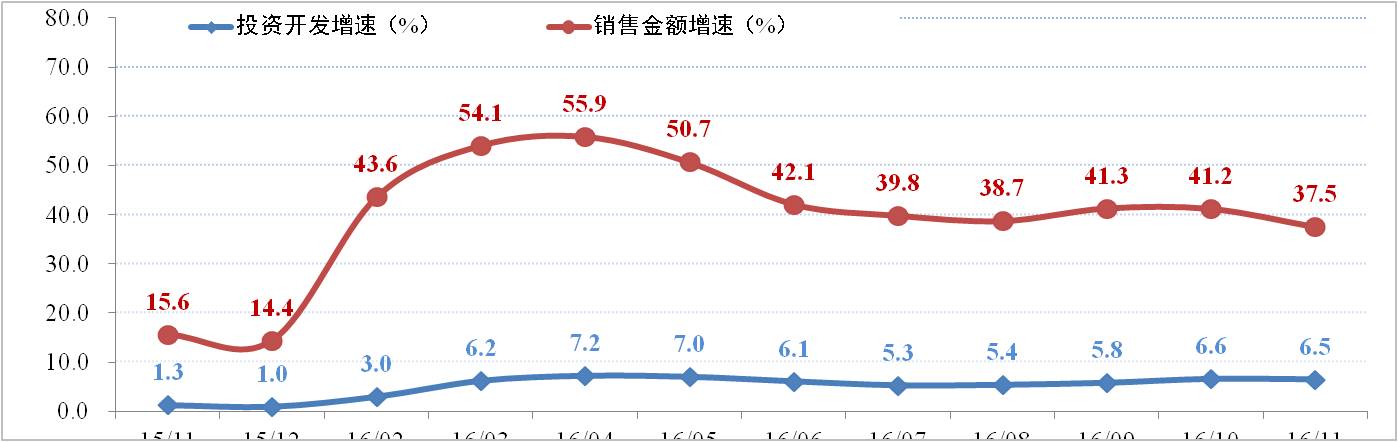 開發(fā)投資方面:2016年1-11月份,全國房地產(chǎn)開發(fā)投資同比增長6.5%,增速環(huán)比回落0.1個(gè)百分點(diǎn)。其中,住宅投資同比增長6.0%,增速提高0.1個(gè)百分點(diǎn)。住宅投資占房地產(chǎn)開發(fā)投資的比重為67.0%,與上月持平。