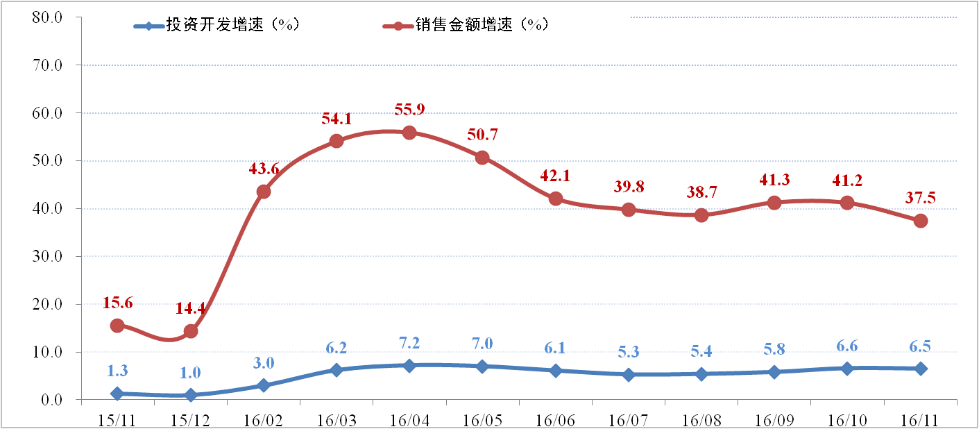 銷售待售方面:2016年1-12月份,全國(guó)商品房銷售金額同比增長(zhǎng)34.8%,增速環(huán)比回落2.7個(gè)百分點(diǎn)。其中,住宅銷售額增長(zhǎng)36.1%,辦公樓銷售額增長(zhǎng)45.8%,商業(yè)營(yíng)業(yè)用房銷售額增長(zhǎng)19.5%。在統(tǒng)計(jì)期內(nèi),商品房待售面積環(huán)比增加0.64%,其中住宅待售面積環(huán)比下降0.49%。