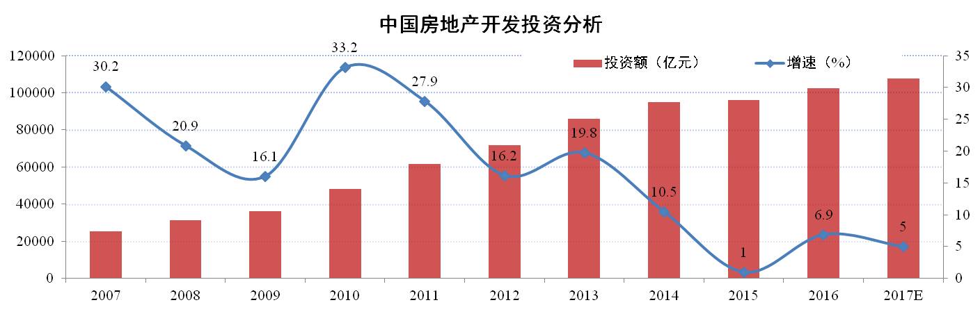 2017年政府工作報(bào)告再次明確房地產(chǎn)居住屬性定位,指出堅(jiān)持住房的居住屬性,落實(shí)地方政府主體責(zé)任,加快建立和完善促進(jìn)房地產(chǎn)市場(chǎng)平穩(wěn)健康發(fā)展的長(zhǎng)效機(jī)制,以市場(chǎng)為主滿足多層次需求,以政府為主提供基本保障。預(yù)計(jì)2017年隨著調(diào)控政策不斷疊加、調(diào)控效果不斷釋放,市場(chǎng)降溫幅度將逐步擴(kuò)大,但由于當(dāng)前調(diào)控以穩(wěn)為主,房地產(chǎn)市場(chǎng)總體將呈現(xiàn)平穩(wěn)的趨勢(shì)。因此,2017年房地產(chǎn)開(kāi)發(fā)投資增速或維持在5%以內(nèi),去庫(kù)存和降杠桿仍將是2017年兩大主要任務(wù)。