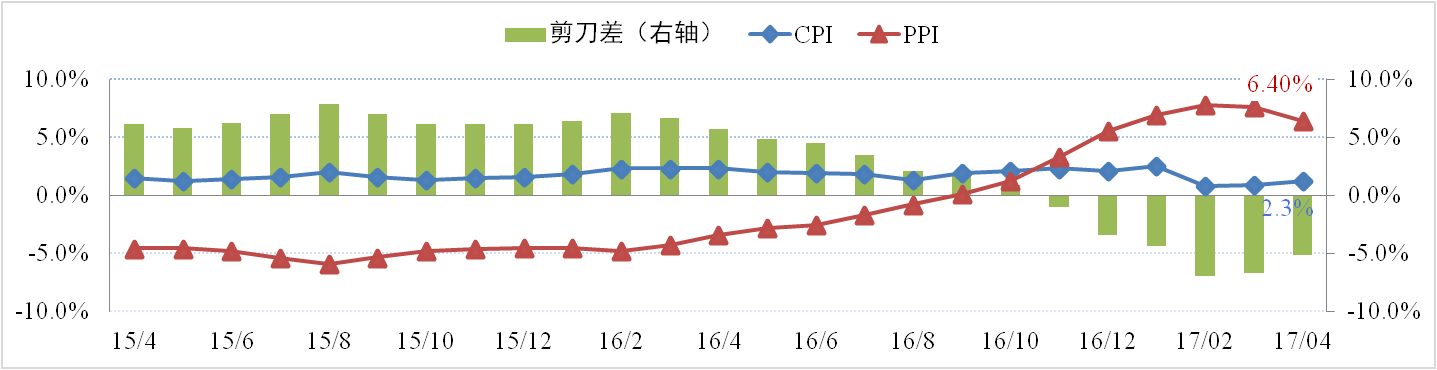 4月份CPI同比上漲1.2%,環(huán)比上漲0.1%;PPI同比上漲6.4%,環(huán)比回落0.4%。CPI連續(xù)兩個(gè)月回升,PPI連續(xù)兩個(gè)月回落,“剪刀差”進(jìn)一步收窄,物價(jià)形勢總體平穩(wěn)。PPI漲幅回落主要受補(bǔ)庫存接近尾聲、需求收縮、大宗商品價(jià)格下跌以及去年低基數(shù)效應(yīng)影響。