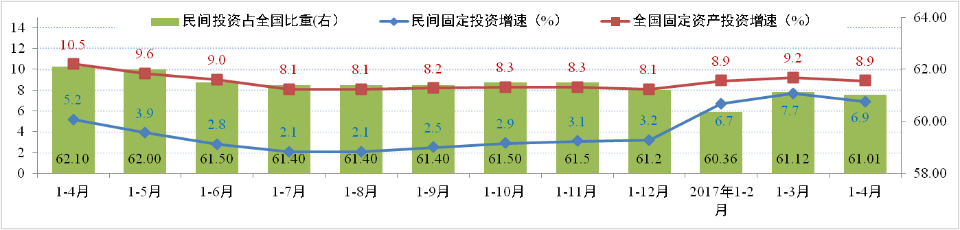 據(jù)國家統(tǒng)計(jì)局統(tǒng)計(jì)數(shù)據(jù)顯示,2017年1-4月全國固定資產(chǎn)投資(不含農(nóng)戶)14.43萬億元,同比增長8.9%,增速比一季度低0.3個(gè)百分點(diǎn)。其中全國民間固定資產(chǎn)投資8.8萬億元,同比增長6.9%,增速比1-3月份低0.8個(gè)百分點(diǎn)。民間固定資產(chǎn)投資占全國固定資產(chǎn)投資(不含農(nóng)戶)的比重為61%。