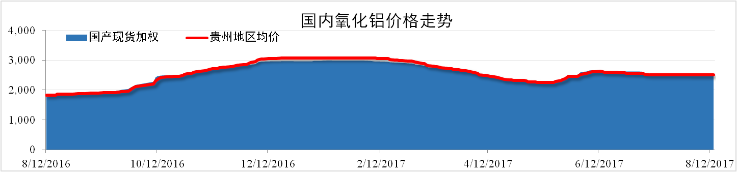 7月份電解鋁與氧化鋁減產(chǎn)消息共同擾動(dòng)氧化鋁市場(chǎng)。由于現(xiàn)貨交易極少,市場(chǎng)難以發(fā)揮價(jià)格發(fā)現(xiàn)的功能。截止8月14日,國(guó)產(chǎn)氧化鋁現(xiàn)貨加權(quán)均價(jià)為2,504元/噸,環(huán)比下跌1.38%。貴州地區(qū)氧化鋁現(xiàn)貨加權(quán)均價(jià)為2,512元/噸,環(huán)比下跌0.48%。