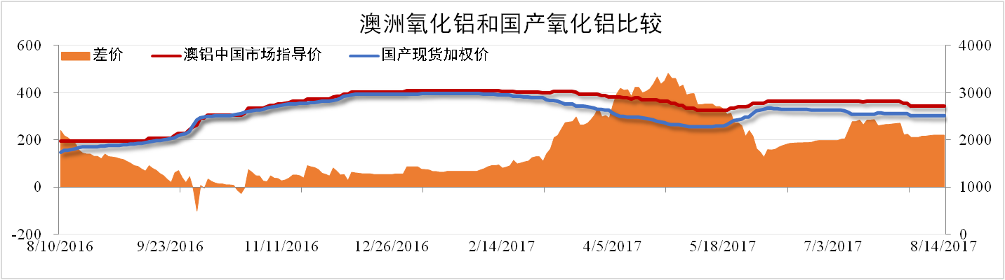 由于澳洲氧化鋁價(jià)格與國(guó)產(chǎn)氧化鋁價(jià)差偏高,因此澳洲進(jìn)口氧化鋁價(jià)格開(kāi)始走低。截止7月31日,澳洲氧化鋁中國(guó)市場(chǎng)指導(dǎo)價(jià)為2,775元/噸,環(huán)比下跌1.77%,國(guó)內(nèi)氧化鋁加權(quán)價(jià)格2,549元/噸,價(jià)差縮小至226元/噸。