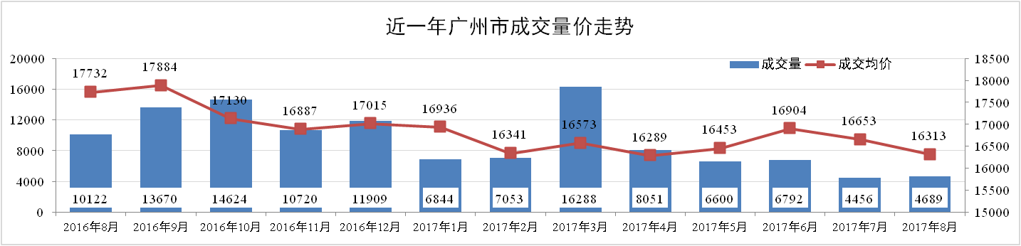 2017年8月,廣州一手住宅網(wǎng)簽呈現(xiàn)量增價(jià)跌現(xiàn)象。其中,一手網(wǎng)簽成交4689套,同比下降53.68%,環(huán)比上升5.23%;一手住宅網(wǎng)簽均價(jià)為16313元/平方米,同比下降8%,環(huán)比下跌2 %。