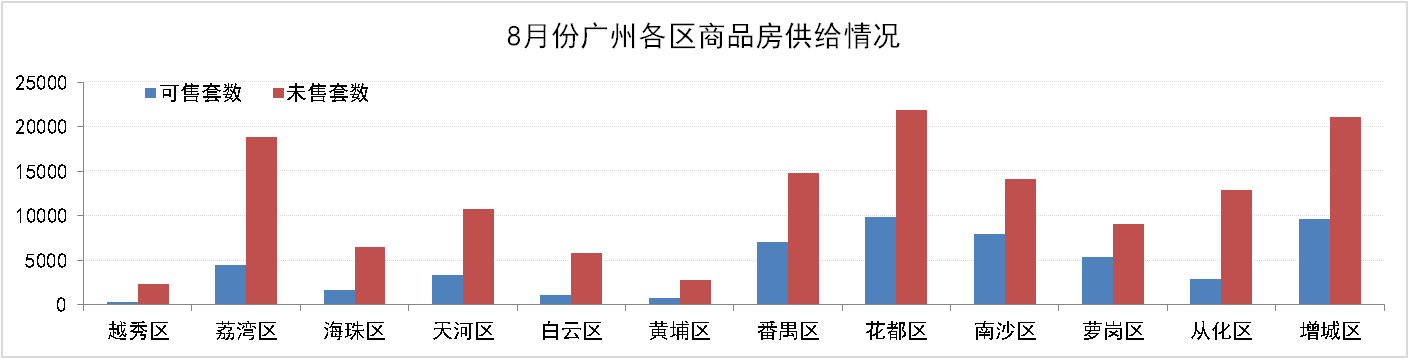8月31日,廣州市新建住宅商品房共194,949套,環(huán)比上升3.1%,其中:可售住宅商品房為54,104套,占比27.75%;未售住宅商品房140,845套,占比72.25%?;ǘ?、增城、番禺、南沙庫(kù)存量較高,可售和未售房源累計(jì)占全市比例分別為63.73%和51.13% 。