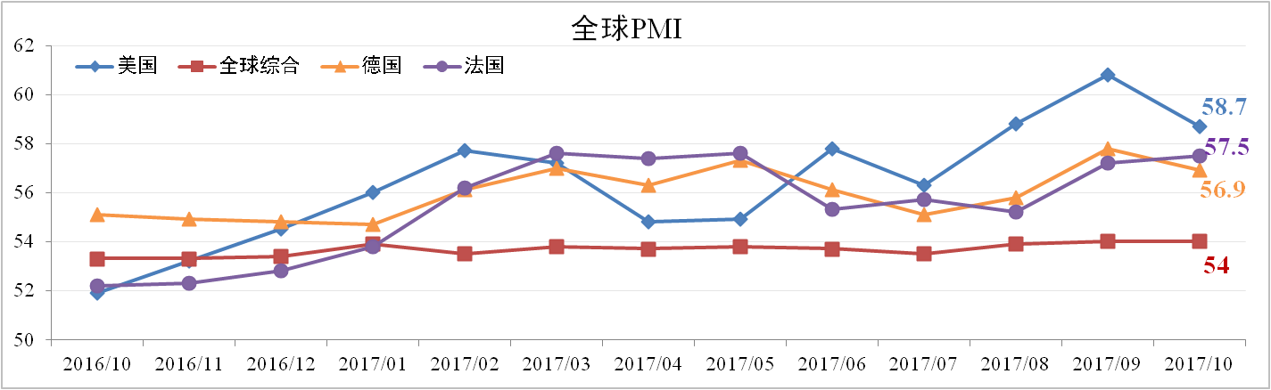 10月全球PMI為54點(diǎn),與上月持平。其中,美國(guó)、德國(guó)PMI分別下滑2.1、0.9點(diǎn)至58.7、56.9點(diǎn),法國(guó)PMI上漲0.3至57.5點(diǎn)。發(fā)達(dá)國(guó)家有小幅下滑,但整體仍處于較高水平,另外,德國(guó)三季度GDP為2.3%大超市場(chǎng)預(yù)期。