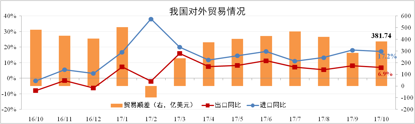 10月我國(guó)進(jìn)口量為1508.06億美元,同比上漲17.2%,出口量為1889.8億美元,同比上漲6.9%,其中機(jī)電與高新技術(shù)出口分別為8.2%與8.8%,高于總出口增速,出口結(jié)構(gòu)繼續(xù)改善。10月貿(mào)易順差381.74億美元,同比下降20.9%。