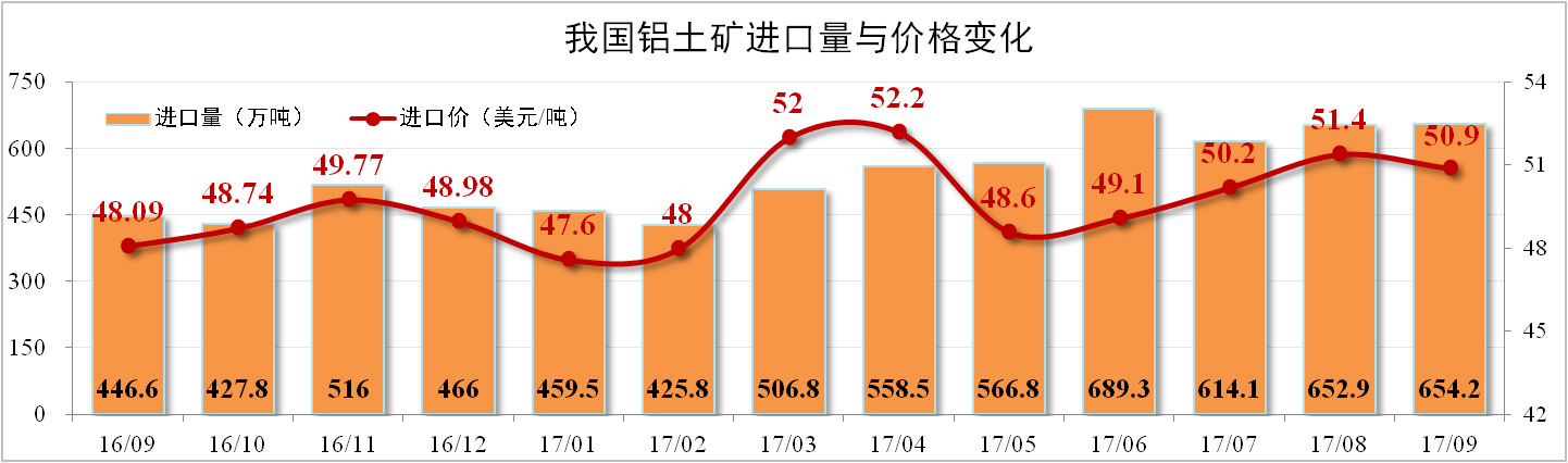9月我國(guó)鋁土礦進(jìn)口量達(dá)654.2萬(wàn)噸,同比增長(zhǎng)46.48%,環(huán)比增長(zhǎng)0.2%。其中澳洲進(jìn)口量達(dá)283萬(wàn)噸創(chuàng)下歷史新高。鋁土礦進(jìn)口價(jià)格微幅下降至50.9美元/噸,環(huán)比下降0.97%。