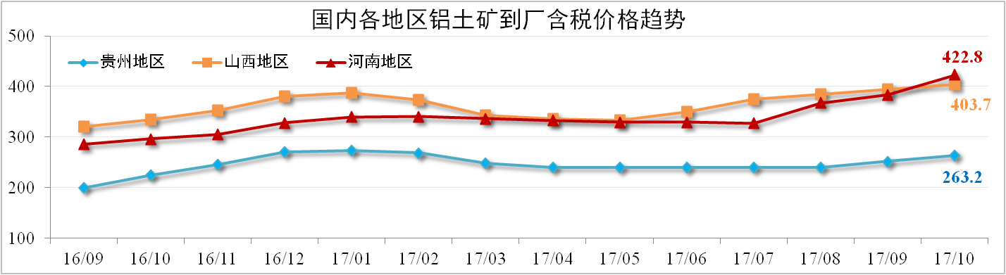 受十九大、環(huán)?;橐约把趸X需求旺盛的影響,10月份鋁土礦供應(yīng)緊缺加劇,價(jià)格不斷上揚(yáng)。其中,貴州(AL:60%,A/S:5.5-6.5)礦石含稅價(jià)達(dá)到263.2元/噸,環(huán)比上漲4.69%;河南地區(qū)報(bào)422.8元/噸,環(huán)比上漲10.31%。