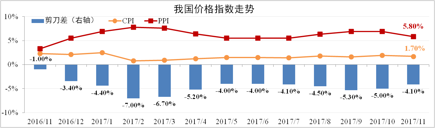 11月我國CPI為1.7%,較10月收縮0.2個百分點,不及市場預期。PPI為5.8%,較上月大幅下滑1.1個百分點。剪刀差從-5.0%收窄至-4.1%。
