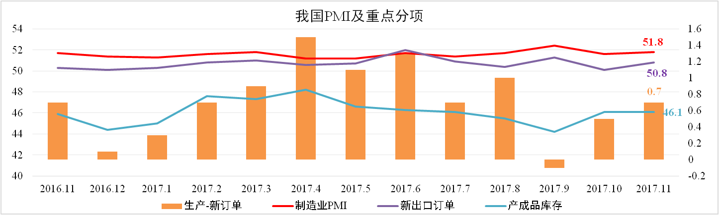 11月我國制造業(yè)PMI為51.8,較10月上升0.2。其中生產指數與新訂單指數差額擴大0.2至0.7,新出口訂單上升0.7至50.8,產成品庫存與上月持平于46.1。