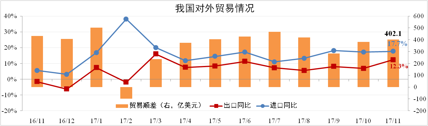 11月我國進口量為1771.68億美元,同比上漲17.7%,出口量為2173.82億美元,同比上漲12.3%,二者均大超市場預期。11月貿易順差402.14億美元,同比下降6.92%,環(huán)比上漲5.33%。