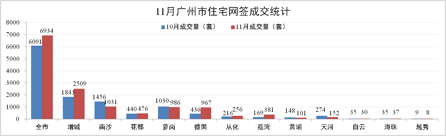 11月,廣州一手住宅網(wǎng)簽量成交6,934套,同比下降26.69%,環(huán)比上升13.84 %,大盤整體帶動市場上揚。
