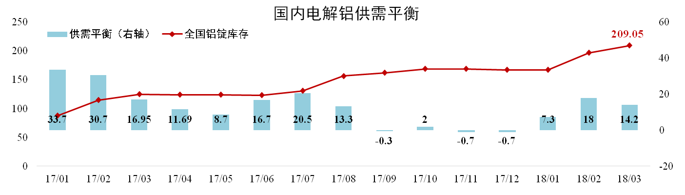 發(fā)稿時間:2018-04-27據(jù)阿拉丁數(shù)據(jù),3月份我國電解鋁產量302萬噸,同比下跌2.89%,環(huán)比上升9.14%。凈進口0.2萬噸,總供應量302.2萬噸,總消費量288萬噸,當月理論供應過剩14.2萬噸。3月底全國鋁錠庫存209.05萬噸,環(huán)比上漲6.22%。