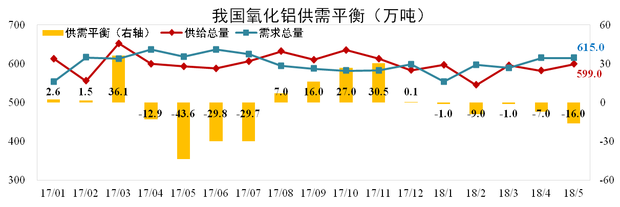發(fā)稿時間:2018-06-22截至5月底,我國氧化鋁建成產(chǎn)能8167萬噸,運行產(chǎn)能7297萬噸,開工率89.35%,環(huán)比上升1.17個百分點。其中國內(nèi)氧化鋁產(chǎn)量607萬噸,進(jìn)口氧化鋁8萬噸,供給總量599萬噸,測算的需求量為615萬噸,理論短缺16萬噸。
