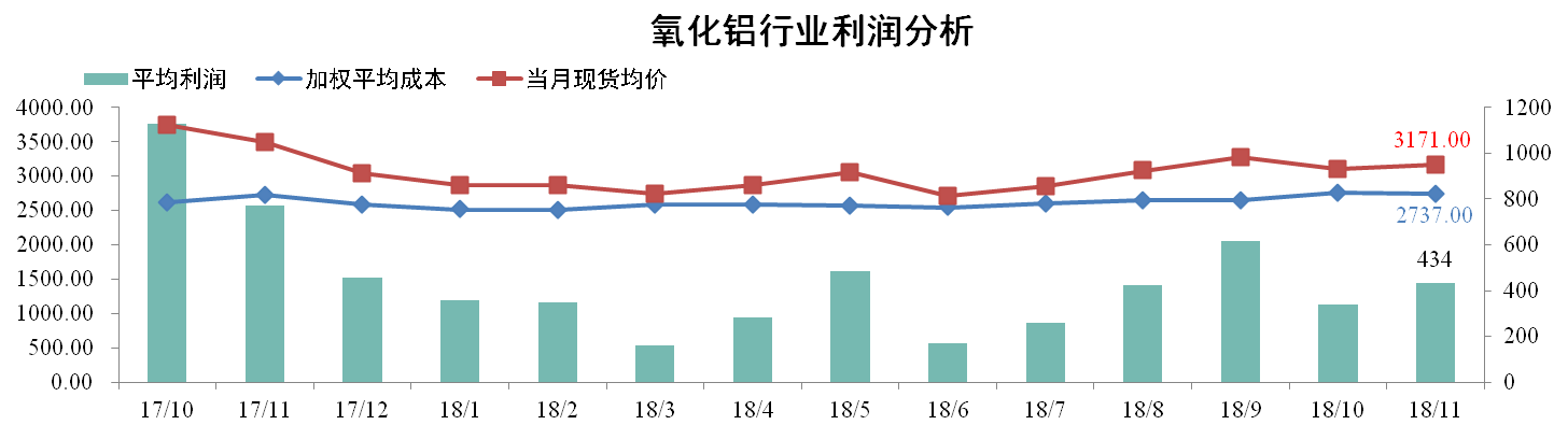 11月份國內(nèi)氧化鋁加權(quán)平均成本為2737元/噸,較上月下降0.76%。當(dāng)月全國氧化鋁現(xiàn)貨成交均價(jià)為3171元/噸,較上月上漲2.30%。理論氧化鋁行業(yè)平均利潤水平為434元/噸。