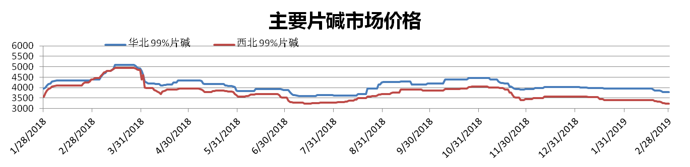 2月份國內(nèi)片堿的總體成交有所下降,市場整體走勢繼續(xù)下行。截止到2月28日,西北99%片堿市場價為3225元/噸,環(huán)比下降3.42%;華北99%片堿市場價為3775元/噸,環(huán)比下降1.79%。