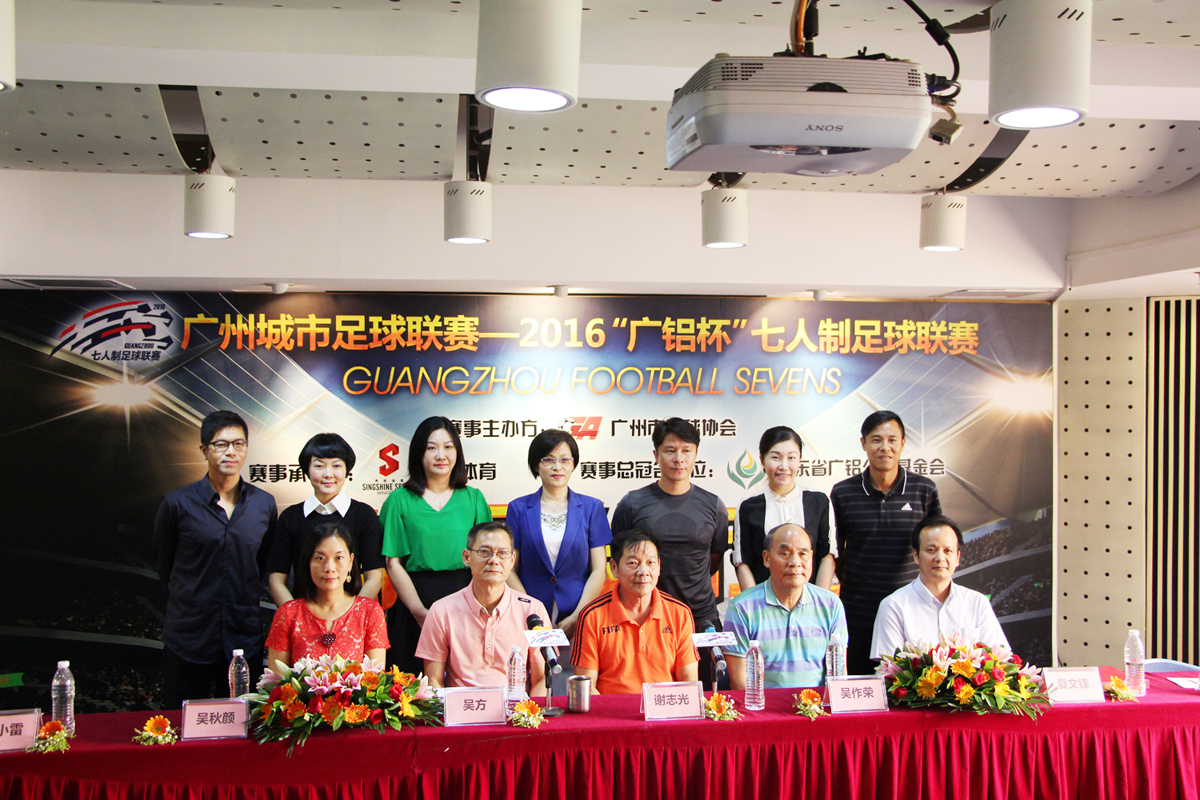8月10日,由廣東省廣鋁公益基金會獨家冠名贊助、廣州市足球協(xié)會主辦、聲色體育承辦的廣州市城市足球聯(lián)賽—2016“廣鋁杯”七人制足球聯(lián)賽新聞發(fā)布會于越秀山體育場隆重召開。出席的嘉賓有廣州市足球協(xié)會主席謝志光先生,廣州市足球協(xié)會副秘書長吳方先生,廣東省廣鋁公益基金會理事長吳作榮先生、監(jiān)事暨本次賽事主委會榮譽主席夏文鋒先生、秘書長董小雷、理事吳秋顏女士、理事鄭麗華、理事丘偉娟,廣州聲色體育活動策劃有限公司總經(jīng)理曾巧瑩女士,足球名宿彭偉國、足球名宿胡志軍、著名體育評述員丁偉杰。