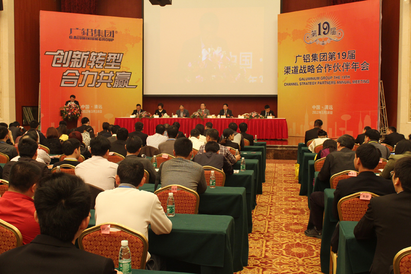 2012年3月18日,廣鋁集團于廣東清遠恒大隆重舉辦了“廣鋁集團第十九屆渠道戰(zhàn)略合作伙伴年會”,此次年會以“創(chuàng)新轉(zhuǎn)型,合力共贏”為核心,攜手核心伙伴共同探討與分享企業(yè)轉(zhuǎn)型升級之路及經(jīng)營與管理之道。