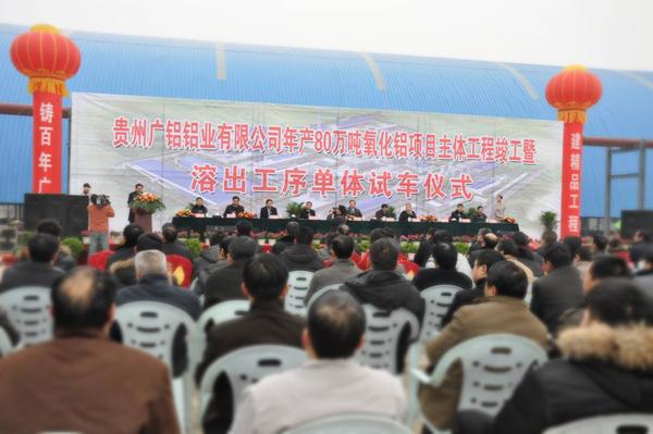 2011年12月28日已經(jīng)進(jìn)入冬至?xí)r節(jié),但在我們貴州廣鋁氧化鋁項(xiàng)目現(xiàn)場(chǎng)似乎看不到一絲寒意。這里處處是彩旗飄揚(yáng)、鑼鼓喧天,一片繁忙的景象。省、市各級(jí)領(lǐng)導(dǎo)、各界來賓和設(shè)計(jì)單位、監(jiān)理單位、施工單位的有關(guān)領(lǐng)導(dǎo)都熱情相聚在這里,來共同見證本項(xiàng)目繼2009年6月8日舉行隆重開工典禮以來的又一個(gè)重要的里程碑——貴州廣鋁清鎮(zhèn)市年產(chǎn)80萬噸氧化鋁項(xiàng)目主體工程竣工暨溶出工序單體試車儀式。