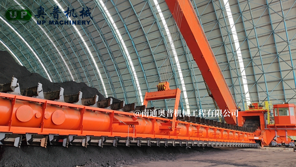 ▲南通奧普機(jī)械創(chuàng)新研制的“雙刮板、雙卷?yè)P(yáng)、翹尾式”半門式刮板取料機(jī)