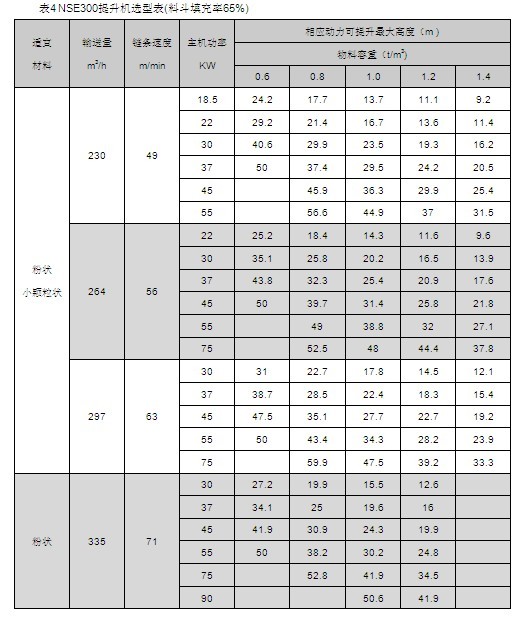NSE系列高速板鏈斗式提升機(jī)共有九種基本型號(hào):NSE100、NSE200、NSE300、NSE400、NSE500、NSE600、NSE700、NSE800、NSE1000,每種型號(hào)根據(jù)輸送物料的不同,選擇不同的提升速度,提升速度上限<70m/min,提升高度上限65m。另外,奧普公司還可根據(jù)用戶要求輸送量介于上述型號(hào)之間的擴(kuò)展型號(hào)。