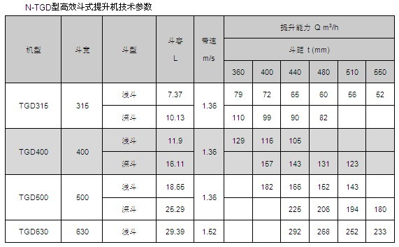 TGD提升機牽引構(gòu)件采用高強度鋼絲繩芯橡膠帶,克服了鏈條嚙合驅(qū)動產(chǎn)生動載荷,較鏈條更輕便,工作平穩(wěn),能以更快的運動速度達到更高的生產(chǎn)率,在同樣的生產(chǎn)條件下,膠帶因其工作速度高和自重較輕,可使物料線載荷和牽引構(gòu)件的線載荷減少,從而減少整機的尺寸和自重。同時由于膠帶具有良好彈性和柔韌性,在料斗進行裝載時有減振作用,由于采用了高強度鋼絲繩芯膠帶,可使提升機的提升高度和輸送量大為提高,因而該產(chǎn)品具有良好的發(fā)展前景。