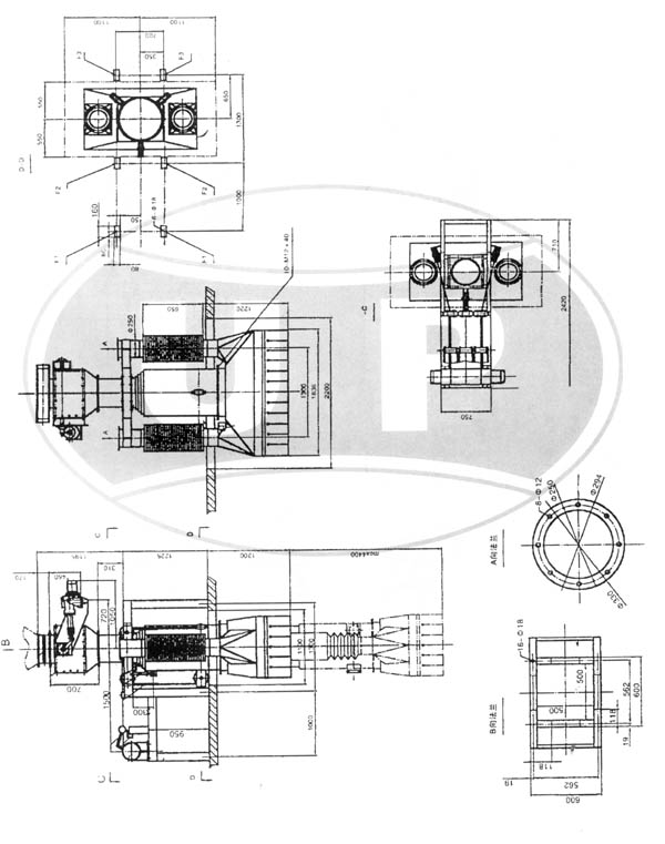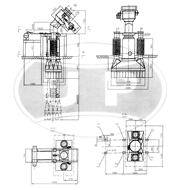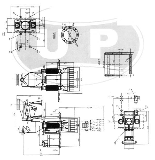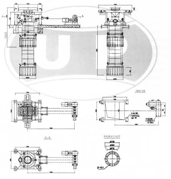 設備基礎及埋件載荷 1.提升裝置:FV=5KN×1.5 FH=20KN×2 2.進料口法蘭:FV=50KN 3.散裝頭基礎:FV=4×10KN×15注四個柱腳止均為:10KN×1.5(系數(shù)) FV垂直載荷 FH為水平載荷 | 主要技術參數(shù) 1.Zui大卸料能力:200-300T/H 2.物料Zui大粒度:小于50mm 3.物料Zui高溫度:小于150° 4.含塵氣體排放量:4500m3/h 5.提升電機功率:2.2-3KW 6.設備自重:3000kg |