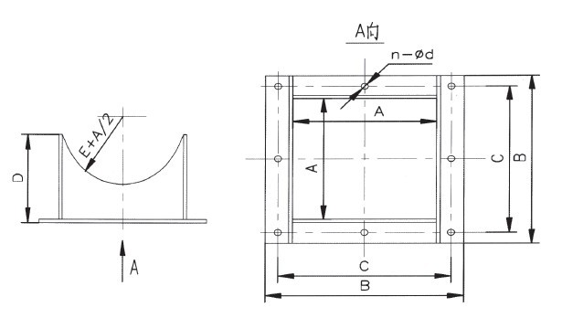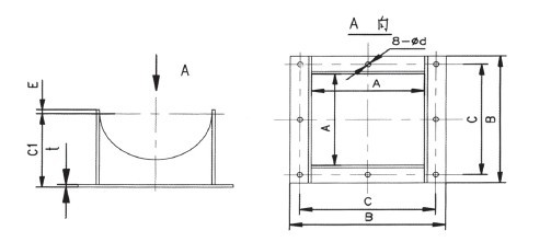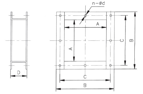 出料口的結(jié)構(gòu)表示如下圖,其系由鋼板折成的方形管及法蘭焊接而成,它不帶能關閉的出料口控制機構(gòu),在使用時將出料口焊于機殼上,其法蘭面與溜槽法蘭相聯(lián),裝配出料口的機殼還應按出料口的內(nèi)孔尺寸開孔。